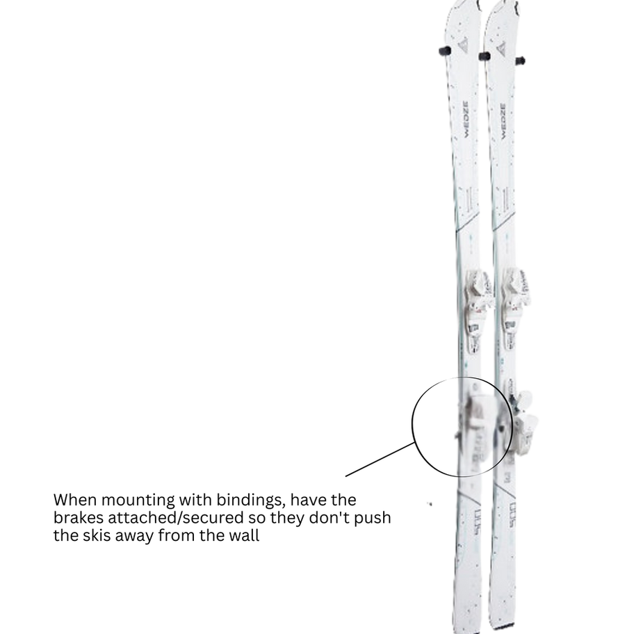 Works With or Without Bindings Adjust mounts to the width of your skis to hang them whether bindings are attached or removed (just ensure brakes are secured when bindings are on).